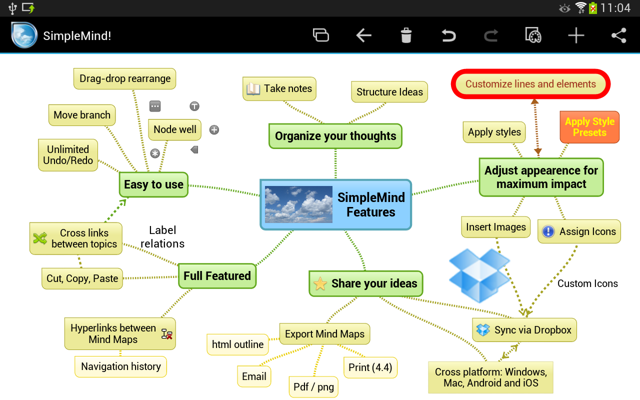 Like other mind mapping apps, you get to choose your theme (color etc) and can simply add nodes to your growing.